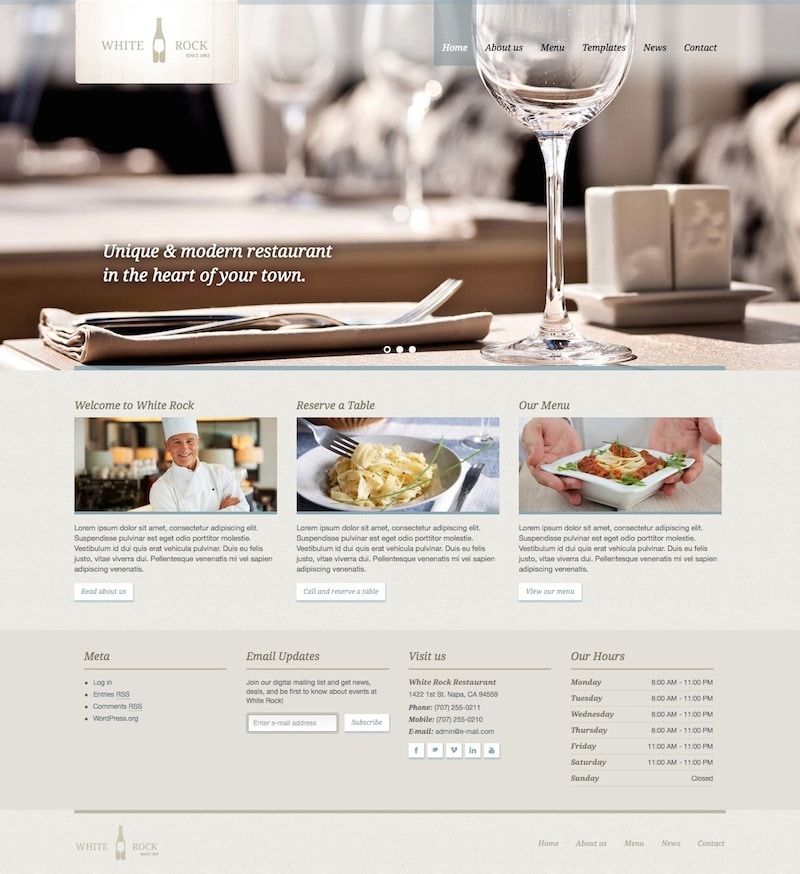 White Rock is a feature-rich WordPress theme which can be used to create all types of different restaurant websites. White Rock is retina ready as well as fully responsive and offers a great bunch of customization options for colors or else. Using the included Flickr and Twitter widgets you can display images from these sources as well and present them nicely on your website.